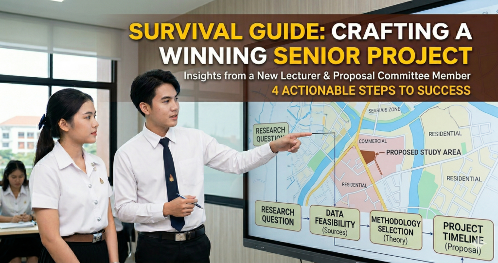 มุมมองจากอาจารย์ใหม่และกรรมการสอบโครงร่างวิทยานิพนธ์ สวัสดีครับน้องๆ ชาวนิสิตนักศึกษาภูมิสารสนเทศ (GIS) ทุกคน! บล็อกนี้พี่เขียนขึ้นในฐานะที่เพิ่งก้าวเข้ามาเป็น อาจารย์ใหม่ และล่าสุดพี่ได้รับหน้าที่สำคัญคือการเป็นหนึ่งในคณะกรรมการสอบหัวข้อโครงงานวิจัยในวิชา ระเบียบวิธีวิจัย (Research Methodology) ซึ่งถือเป็น “ประตูด่านแรก” ของซีรีส์วิชาโครงงาน (Senior Project) ที่นักศึกษา GIS ทุกคนต้องเจอในช่วงปีสุดท้ายก่อนเรียนจบ แม้ว่าบริบทที่พี่เจอจะมาจากรั้วมอดินแดง...